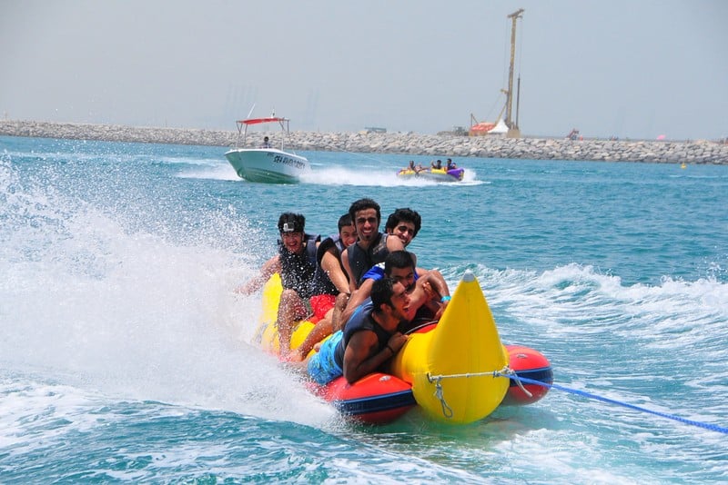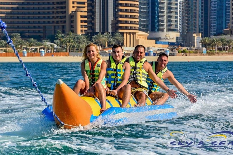 The Banana ride delivers the exhilarating sensation of gliding on water like a jet ski. Enthusiasts of adrenaline, often embarking on family outings or group adventures, are drawn to the Banana Vessel ride, as it accommodates multiple individuals simultaneously. Among the frequently experienced water activities along Dubai's beaches, the Banana boat ride stands out as a popular choice.